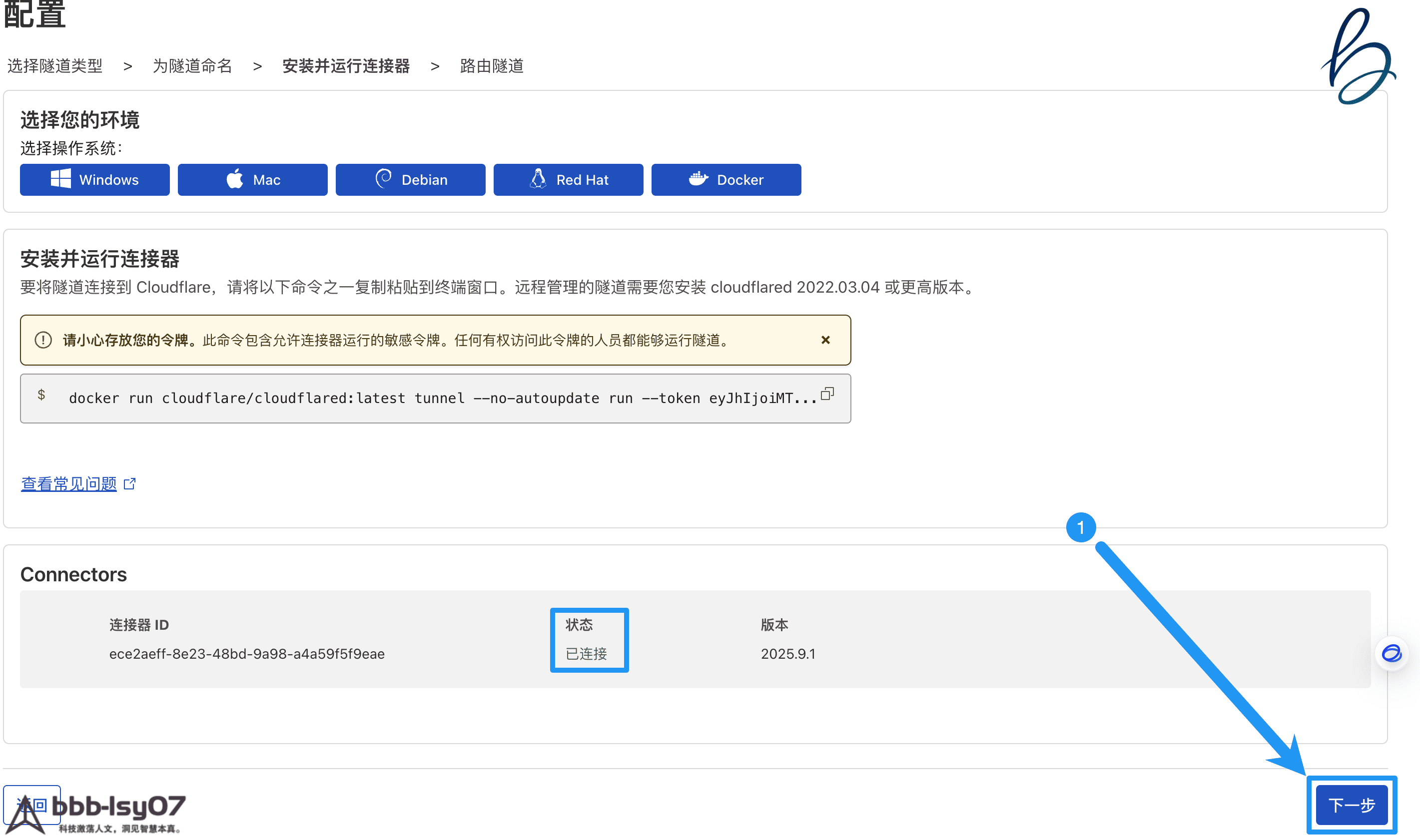 执行后,检查 Connectors 状态,应显示为 已连接(表示服务器已连接到 Cloudflare 网络),点击下一步。